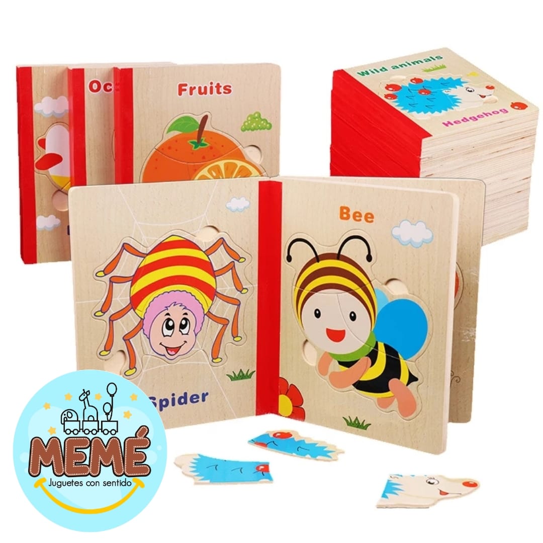 Libro de madera que trae 3 páginas con rompecabezas por cada lado.